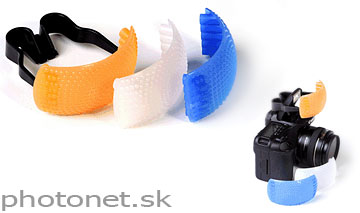 Set difuzerov pre interné blesky. Jednoduchá inštalácia zasunutím do bleskových sánok na tele fotoaparátu. Možnosť nastavenia výšky.Obsahuje 3 kusy difuzerov: biely, oranžový a modrý.