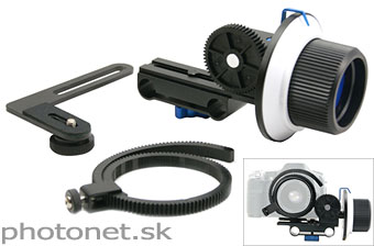 Follow Focus systém kompatibilný so štandardným 15mm koľajnicovým systémom, navyše s možnosťou upevnenia na statívový závit fotoaparátu pomocou priloženého adaptéra. Ovládacie koliesko sa dá upevniť ľubovoľne z pravej alebo ľavej strany objektívu. Flexibilný pás s ozubením je vhodný pre objektívy s priemerom ostriaceho prstenca 52 až 86mm.Technické parametre: