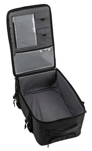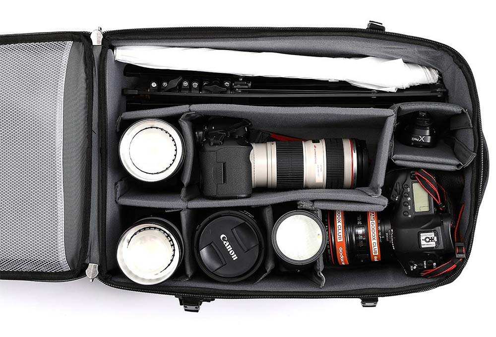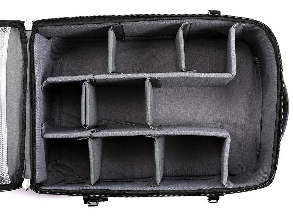 Kufor má dve vonkajšie samostatné vrecká na zips, popruhy na upnutie statívu a pláštenku.