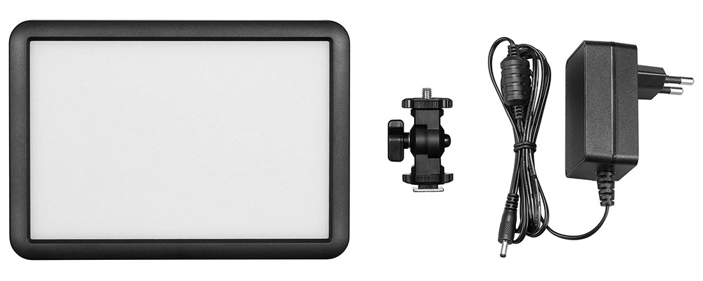 Súčasťou balenia je sieťový adaptér a nastaviteľný kĺbový držiak so štandardným závitom 1/4". Držiak je možné zasunúť do sánok na blesk alebo priskrutkovať na statív.