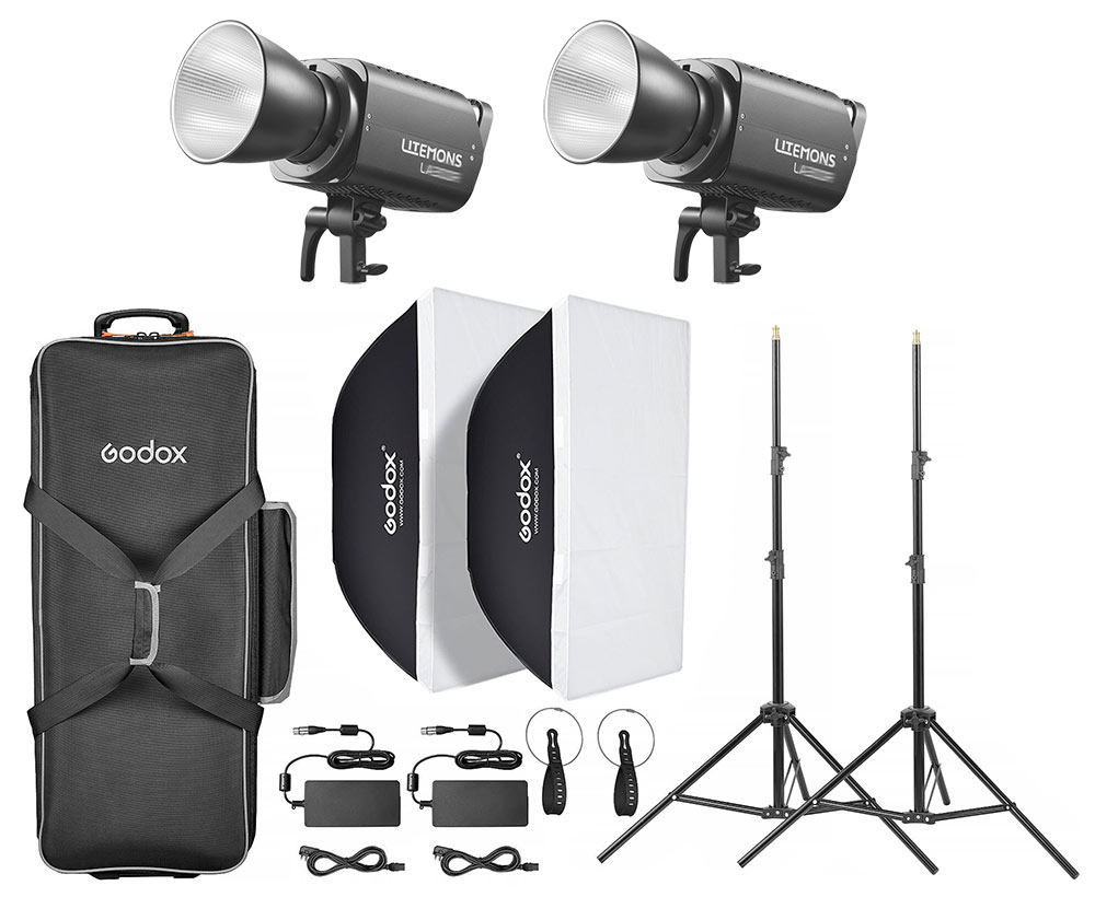 Kit obsahuje dve RGB LED svetlá so softboxami, stojanmi a veľkou transportnou brašnou.