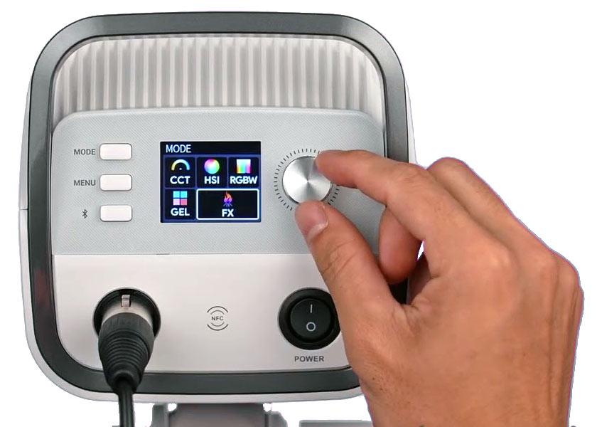 FX - režim svetelných efektov. Je možné vybrať 14 svetelných efektov (party, blesk, TV, oheň, ohňostroj, policajný maják a ďalšie). Je možné meniť parametre zvoleného efektu (rýchlosť, svetelný výkon a pod.).