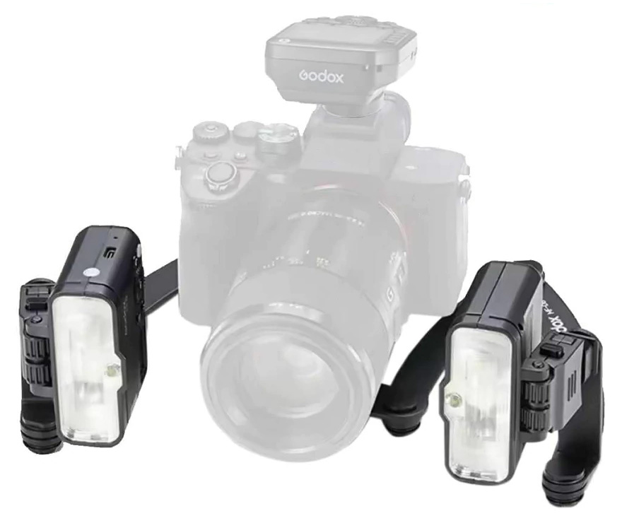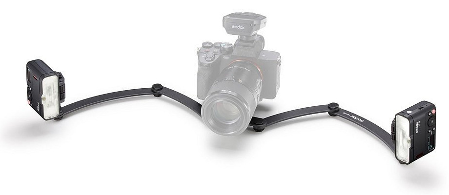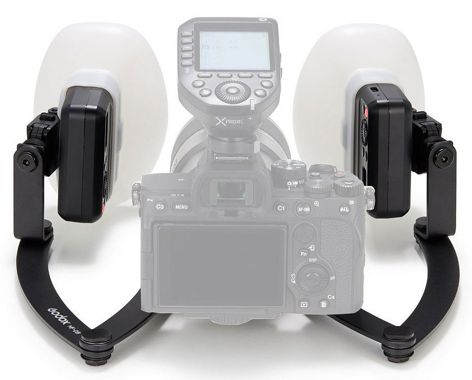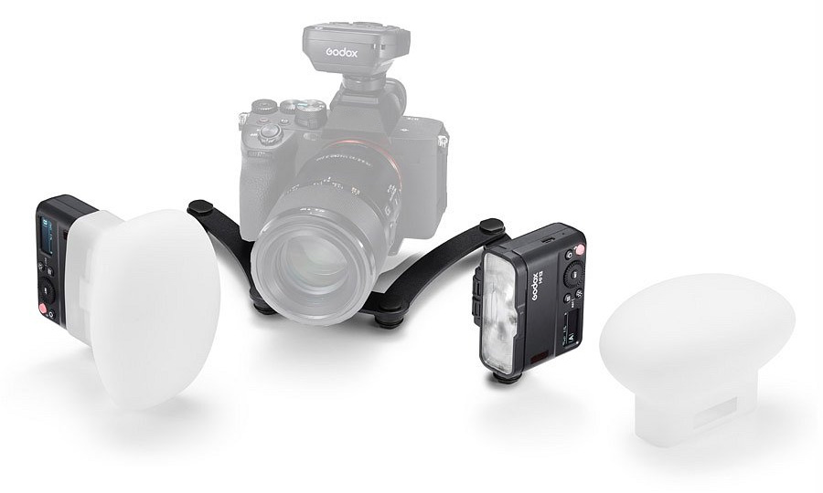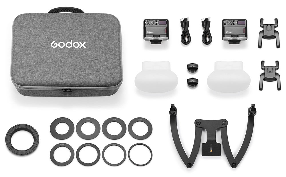 Obsahuje dva blesky Godox MF12, držiak s dvomi ramenami optimalizovaný na prácu v zubnej ambulancii, štandardný okrúhly držiak na objektív s adaptérmi rôznych priemerov (49 až 77mm) a ďalšie príslušenstvo.