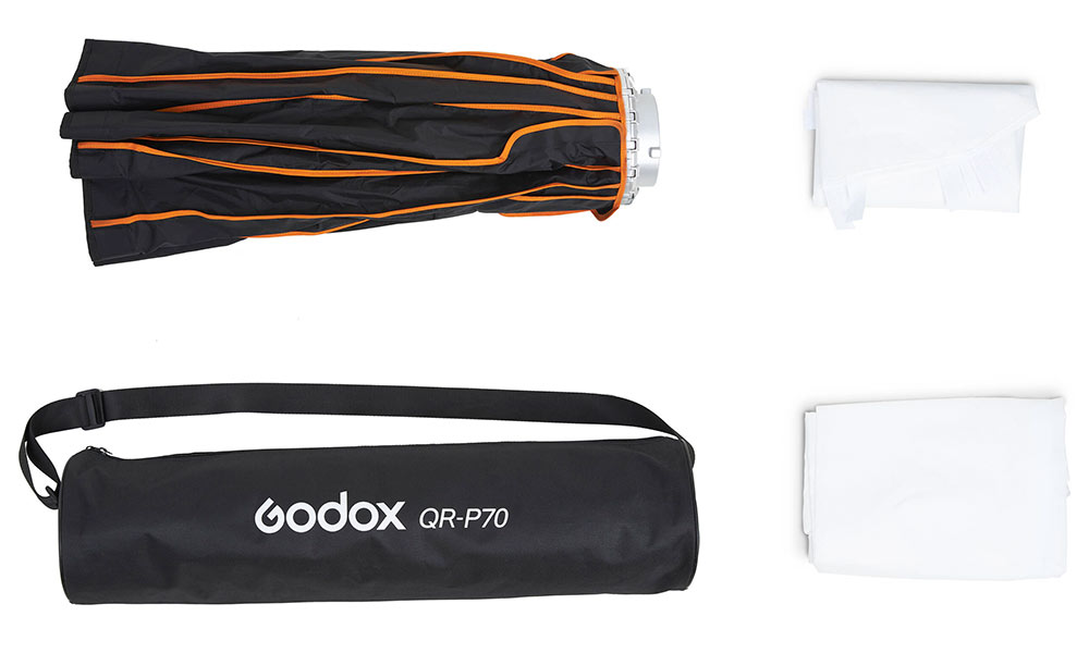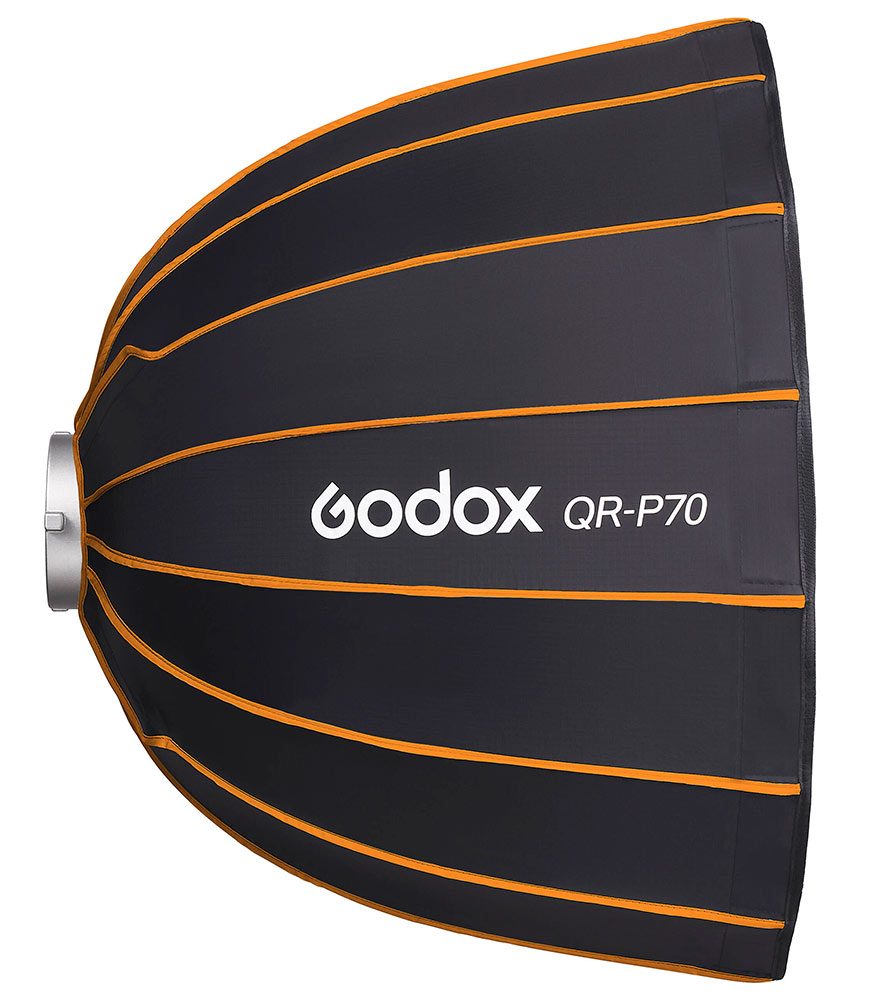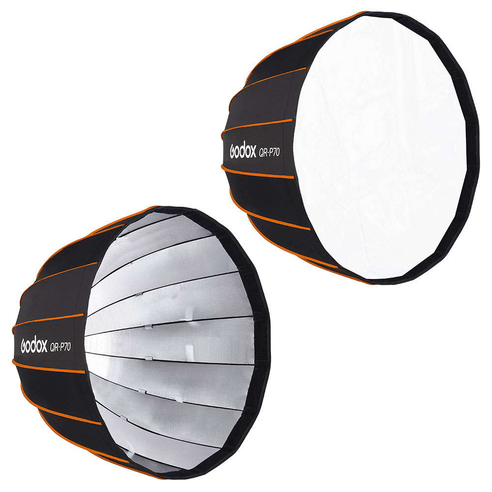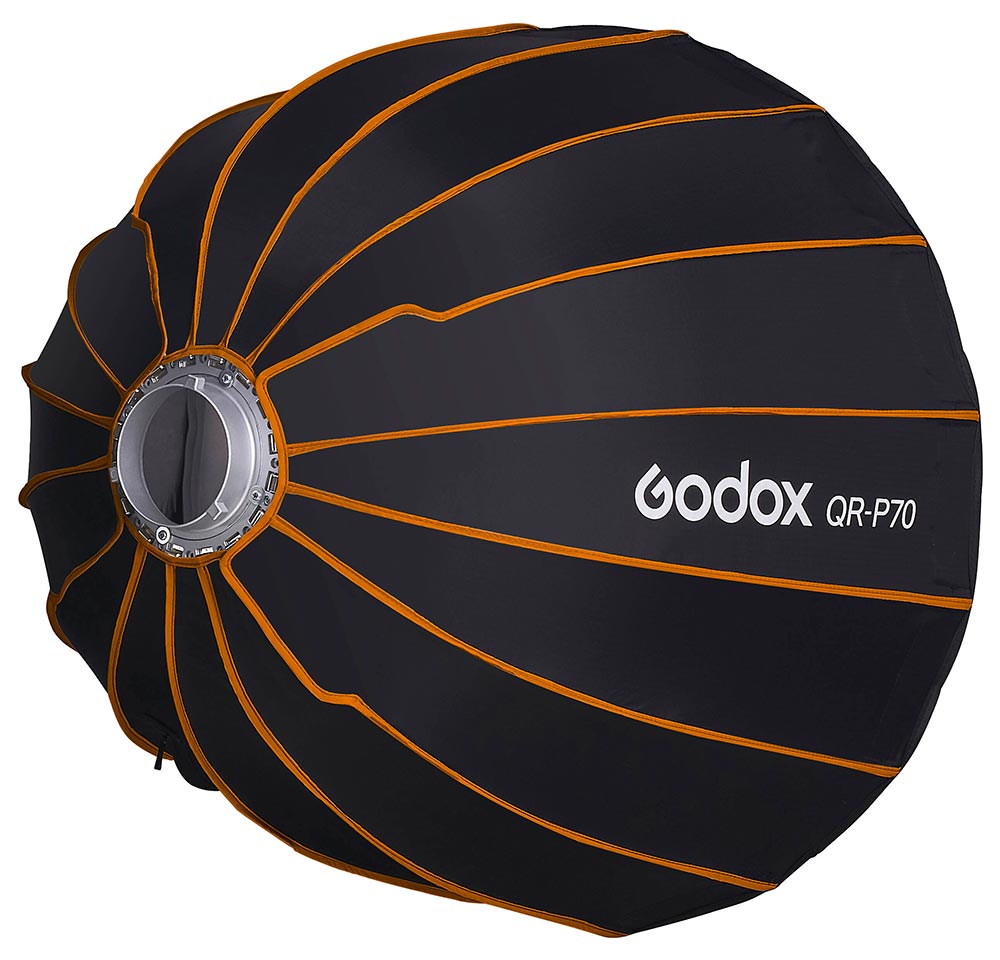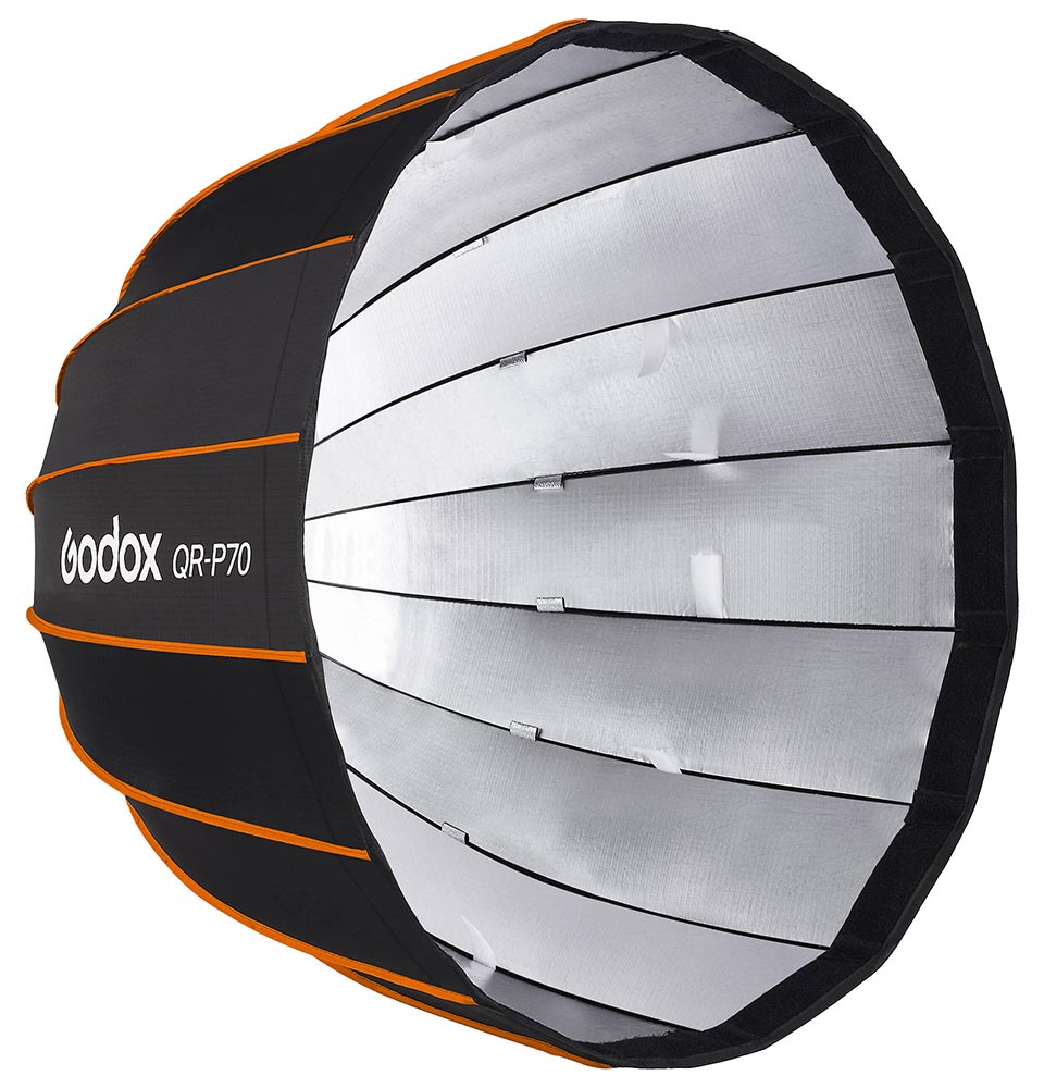 Hlboký parabolický softbox s priemerom 70cm je vybavený upevňovacím bajonetom typu Bowens a systémom rýchleho skladania.