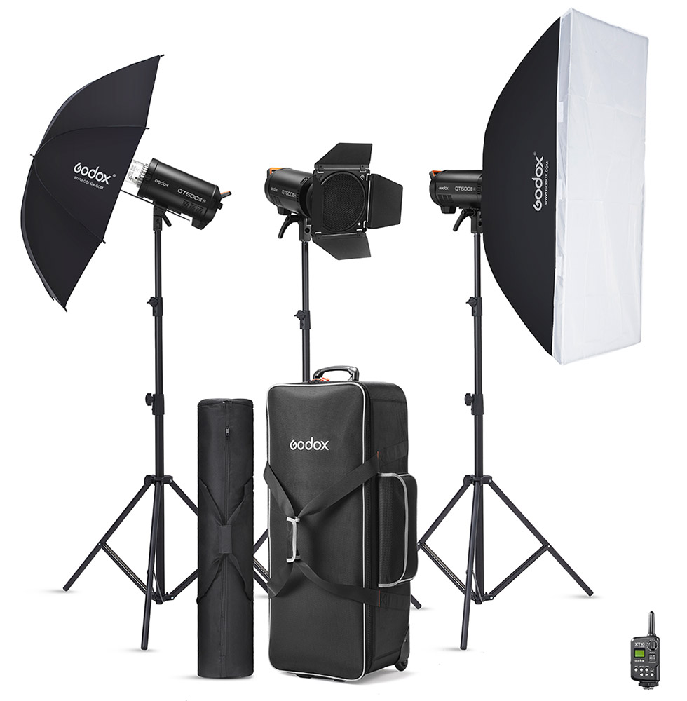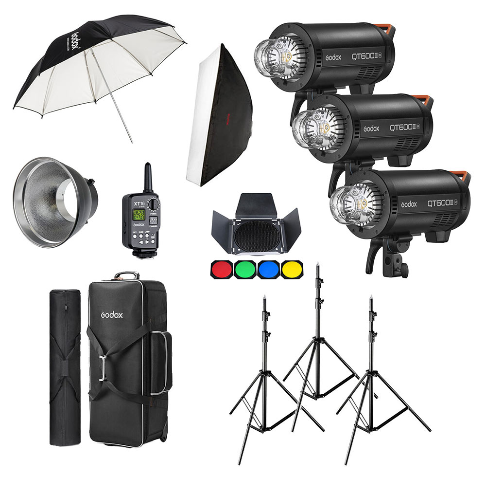 Kit predstavuje cenovo dostupné riešenie pre štúdio s tromi bleskami Godox QT600IIIM, stojanmi, softboxom, dáždnikom, reflektorom, klapkami a odpaľovačom Godox XT16, všetko zabalené v dvoch transportných brašnách.