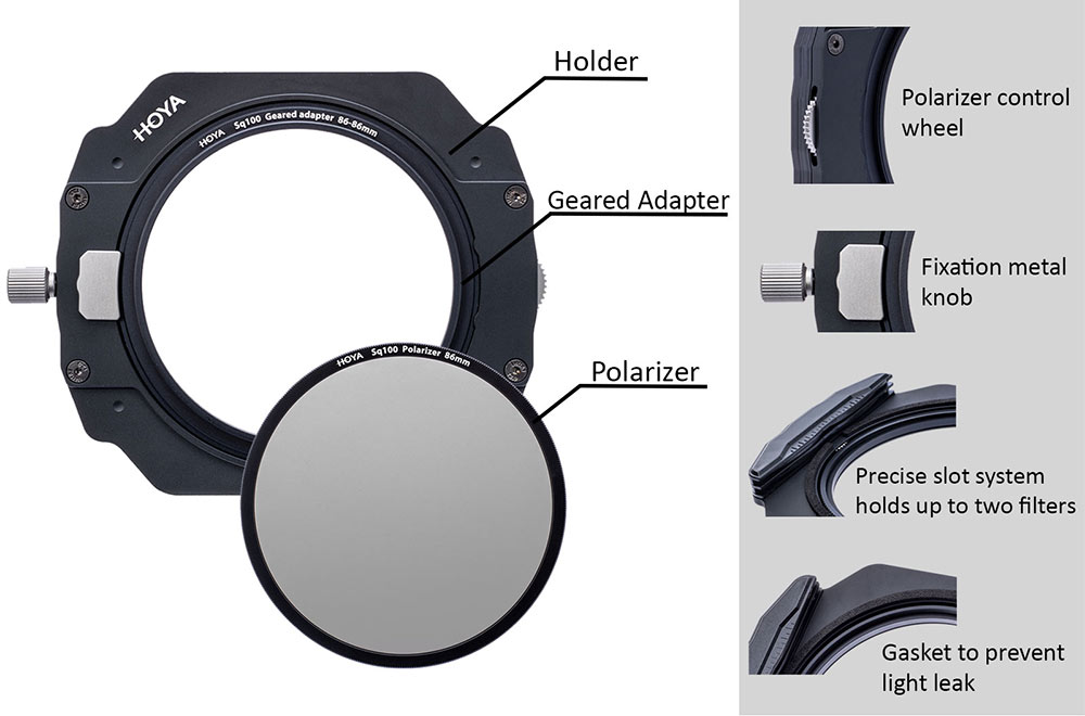 Držiak filtrov Hoya na hranaté filtre série Sq100 so šírkou 100mm, kompatibilný je však aj s hranatými filtrami iných výrobcov.