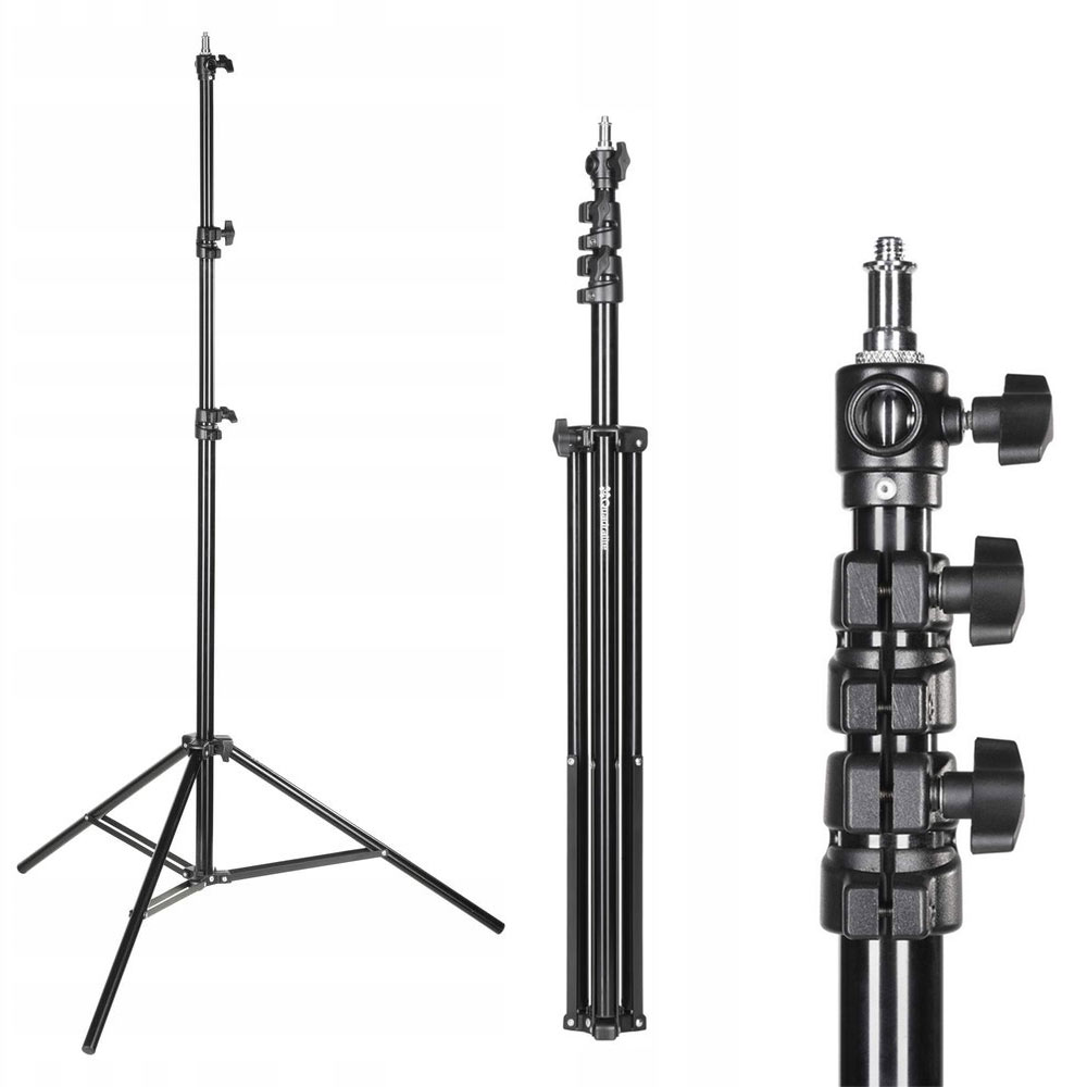 Hliníkový štúdiový statív so vzduchovým tlmením pre lepšiu manipuláciu zostavy s nasadenými zábleskami.Univerzálna hlava je vybavená štúdiovým spigotom a navyše 1/4" a 3/8" štandardným statívovým závitom.