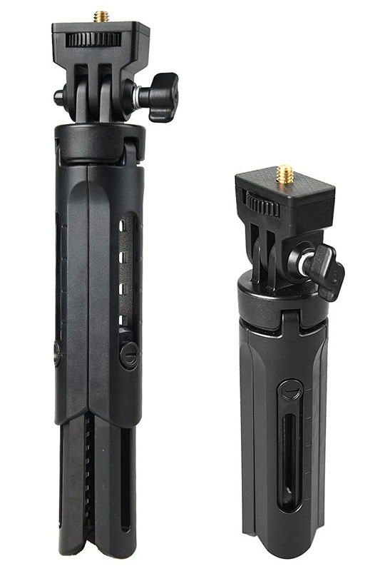 Malý stolový statív vyrobený z ľahkého plastu s nohami vystuženými hliníkovou zliatinou.