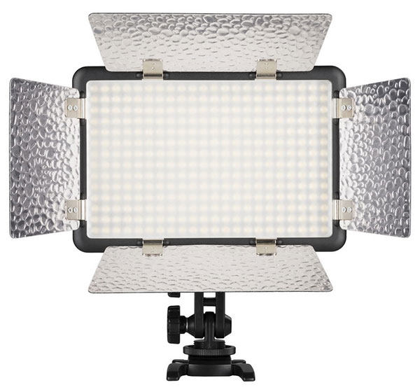 LED svetlo s klapkami, LCD displejom a rádiovým diaľkovým ovládaním.Možnosť upevnenia do bleskových sánok pomocou nastaviteľného kĺbového adaptéra alebo na statív štandardným závitom 1/4".