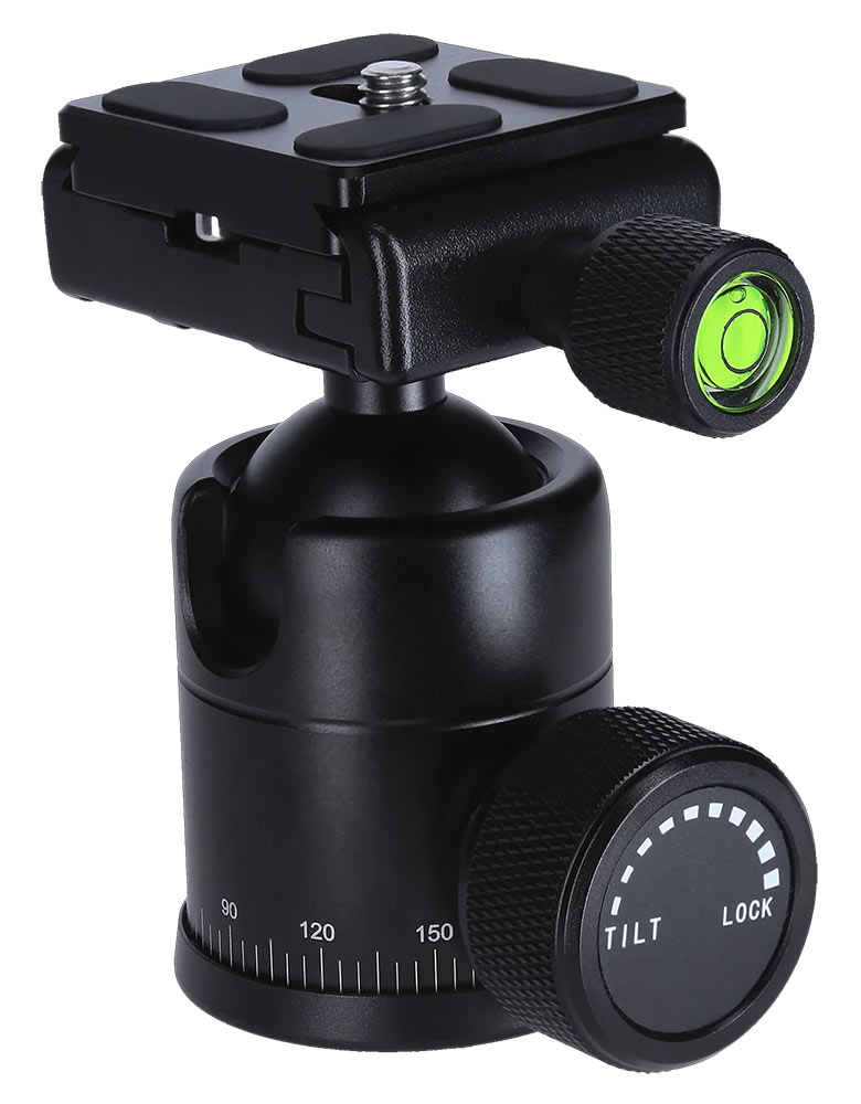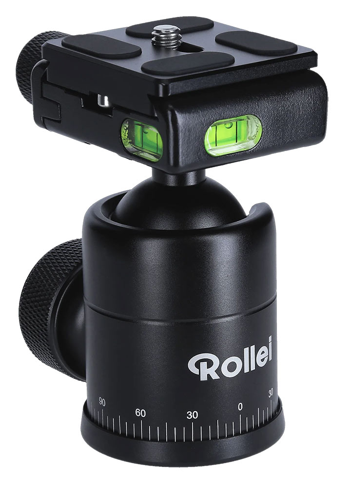 Kompaktná guľová statívová hlava s nízkou hmotnosťou je vybavená rýchloupínacou doštičkou typu Arca-Swiss a tromi vodováhami.